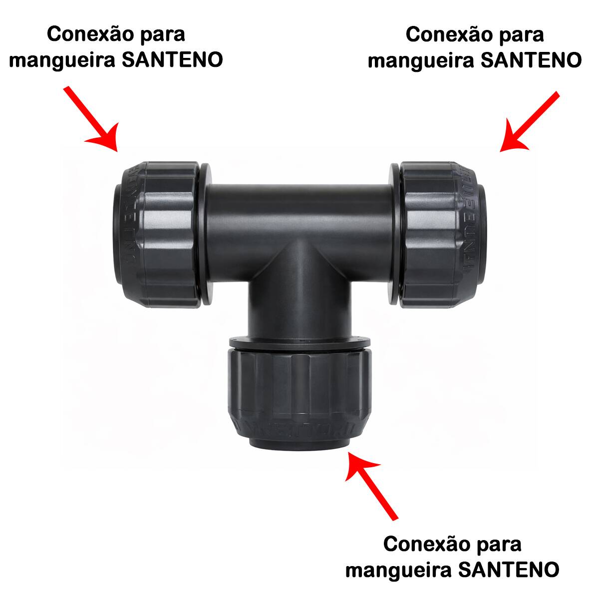 A fabricante projeta a conexão com compatibilidade universal para as mangueiras microperfuradas das linhas Santeno I, II e III. O design mecânico emprega um sistema de espigões estriados triplos acoplados a porcas de travamento por rosca. Esta engenharia de compressão prende o polietileno flexível com absoluta firmeza, eliminando a dependência de abraçadeiras de metal que oxidam, ressecam e ferem a tubulação. O travamento perfeito impede vazamentos estruturais nas junções, bloqueando o desperdício de água e as poças localizadas.